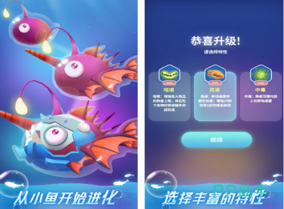 这是一款融合生物进化的休闲游戏,玩家从一条微小鱼类起步,通过吞噬比自己弱小的海洋生物逐步成长。随着体型与能力的增强,最终有望成为海洋霸主。游戏画面采用卡通渲染,营造出梦幻般的海底氛围,操作简单直观,同时具备一定的成瘾性与放松效果。