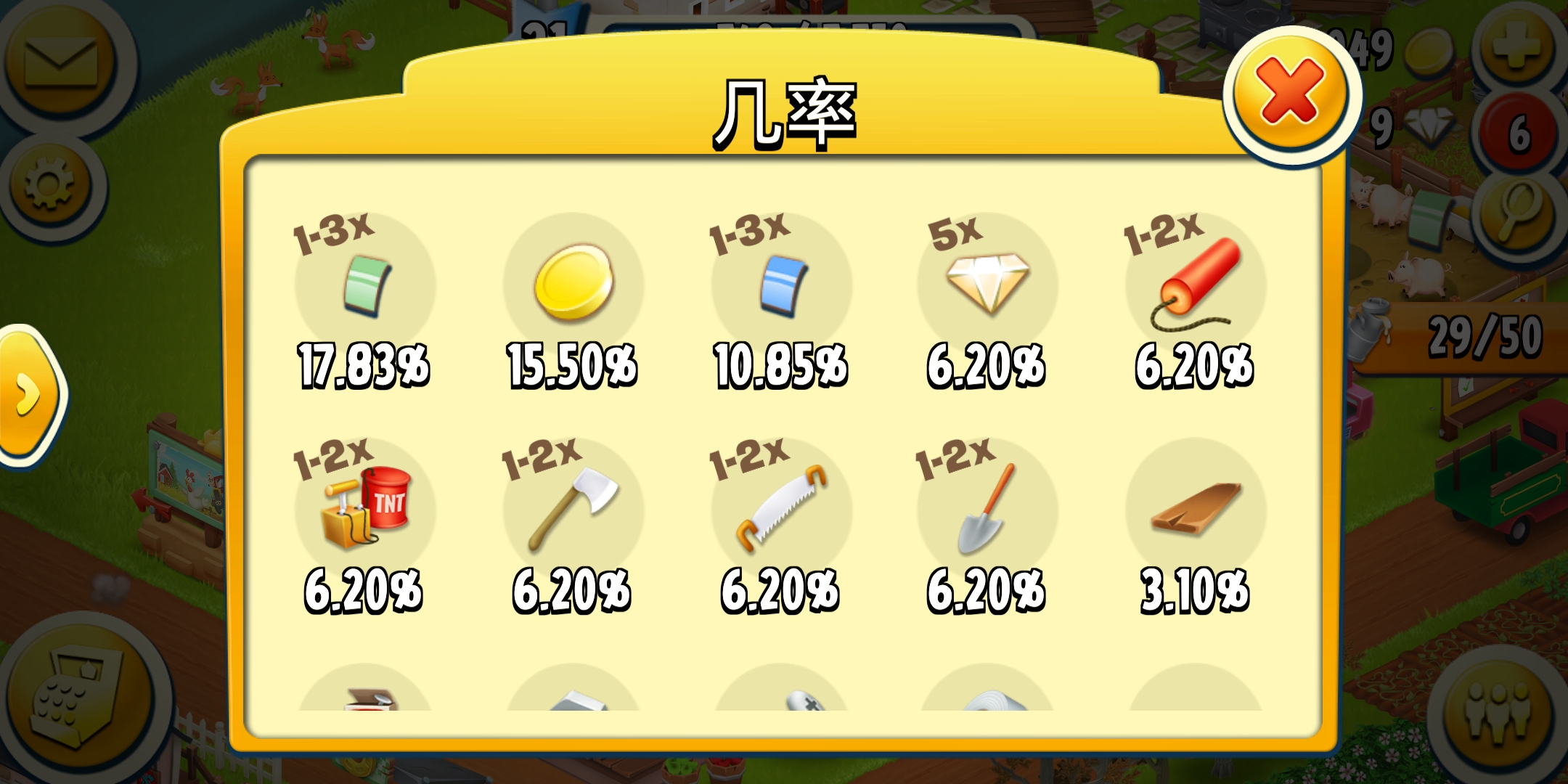礼盒是游戏中的神秘彩蛋,玩家每天可免费领取2个礼盒,点击左上角的骰子可查看能获得礼券的种类。礼盒在玩家待机或造访好友农场时随机出现,可以花费钻石有偿解锁,通常礼盒体积越大奖励的礼券数量就越多。