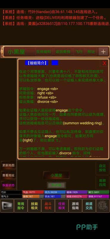首先大家看到的就是这款《文字江湖mud》手游,极高的自由度的展现还是带来了它较为独特的表现,这里面的沉浸式效果的呈现会非常的舒服,游戏之中我们可以体验到诸多的互动玩法,比如像是拜师和结婚这样的玩法,门派的斗争在这里也是相当的复杂,需要大家做出全面的准备才行哦。