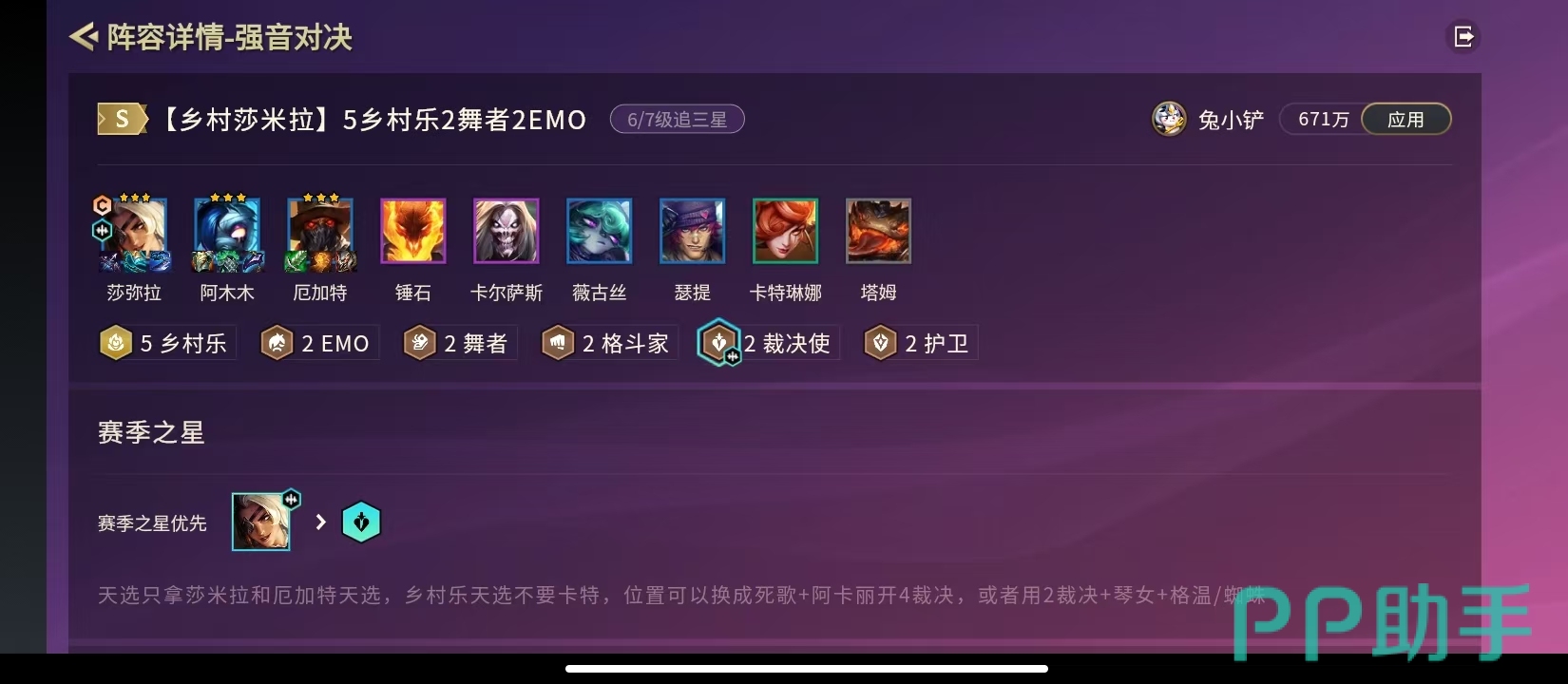 此阵容之所以能在本次更新后异军突起,关键在于召唤机制的极高性价比。玩家无需投入大量经济去追求高费卡三星,只需顺利凑齐九乡村羁绊,触发召唤条件后即可获得扭转乾坤的战斗力。对于前期运营不顺、希望转型冷门路线争取排名的玩家来说,这套体系无疑是理想选择。其实战表现稳定且上限极高,轻松实现以弱胜强,切勿因偏见而低估其实力。