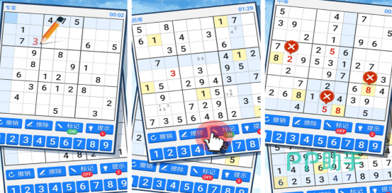 游戏采用拟真书写设计,界面中显示一支铅笔图标,营造纸上解题的真实感。每次输入数字后系统会自动校验正确性,帮助玩家及时发现错误。底部设有提示、擦除等功能按钮,配合一至九的数字选择区,全面提升操作便捷性。通过不断练习,可在限定时间内高效完成高难度数独题目。