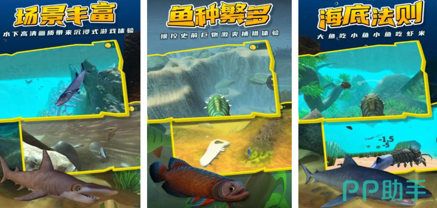 本作延续“大鱼吃小鱼”的经典玩法机制,提供多样化的掠食者角色供玩家选择。初期可操控鲨鱼或鲸类等常见海洋猎手,随着进度推进,还能解锁史前巨兽参与狩猎。游戏内置多个不同地貌特征的海底地图,搭配逼真的3D建模与光影效果,营造出极具代入感的深海环境,让玩家仿佛置身真实海底世界。