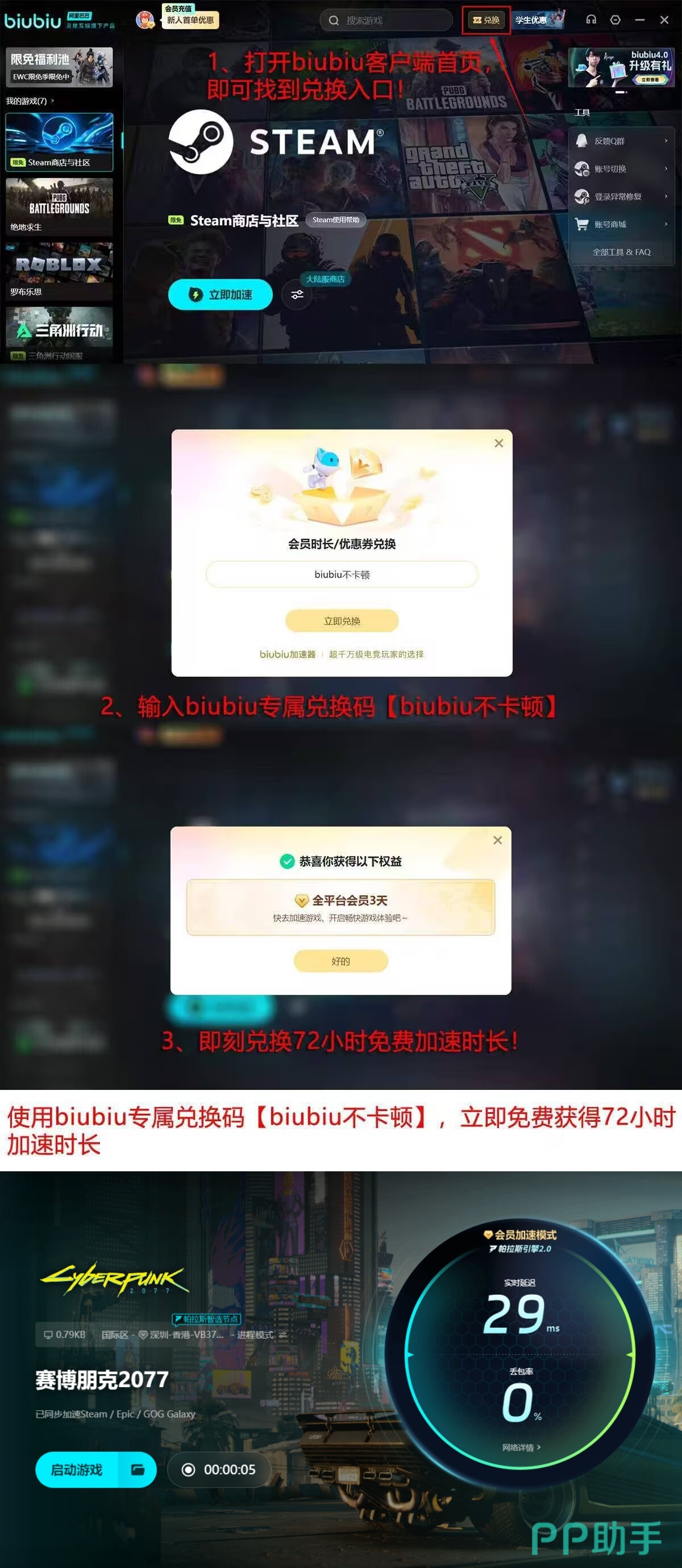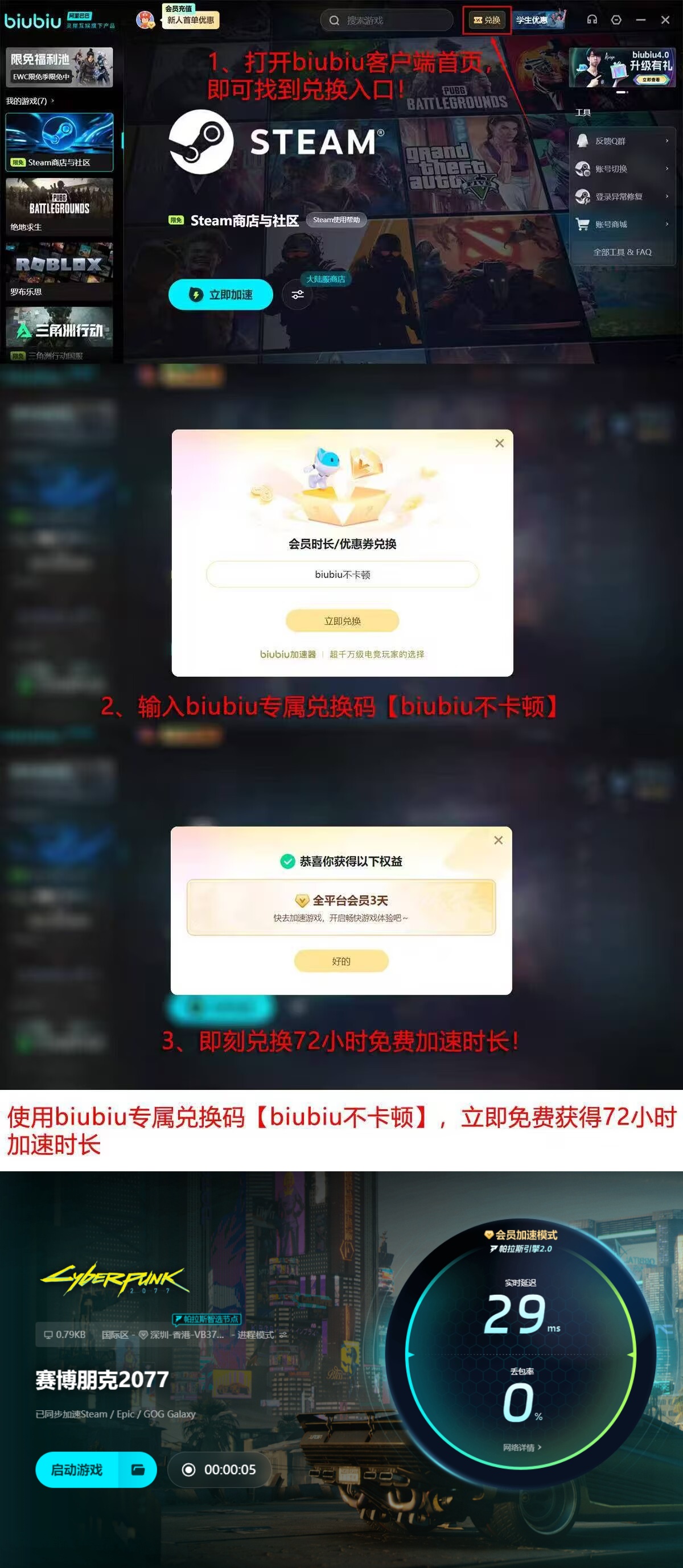 操作上,biubiu加速器延续了简洁易用的设计理念。用户只需在应用内搜索“赛博朋克2077”,选择对应区服即可一键开启加速服务。每次仅对单款游戏进行优化,退出游戏后建议手动停止加速以节省资源。此外,平台还为所有用户提供专属福利:输入口令【biubiu不卡顿】即可领取72小时免费加速时长;首次注册的新用户登录后还将自动获得24小时试用权限。