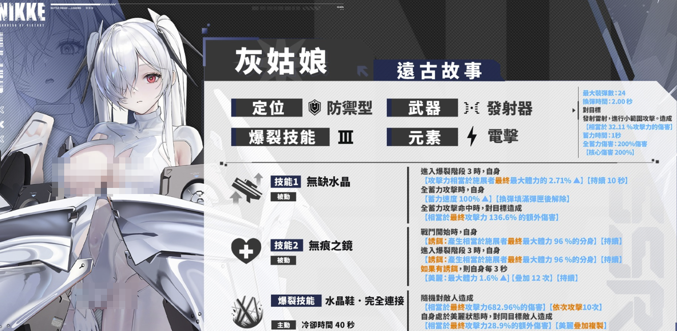 作为防御型角色,灰姑娘可装备容量为24发的重型发射器。普通攻击附带点击触发效果,能够对小范围敌人造成伤害。她的主动技能“水晶鞋爆裂”可在战场上随机发动十次连续打击。当角色进入“美丽”状态时,每次命中都将提升30%的基础伤害输出。此外,“无缺水晶”在爆裂阶段激活后,能为自身附加额外攻击力加成;而“无痕之镜”则可在生命值归零时生成一个等同最大体力的生命分身,并在“美丽”状态下逐步恢复生命值,整体生存与输出能力相当出色。