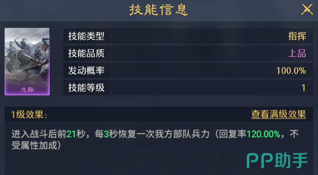 戍脉可在战斗前21秒内,每隔3秒为我方部队恢复相当于兵力120%的生命值。这项治疗效果不依赖属性加成,任何辅助型武将均可携带,提供持久稳定的续航保障。