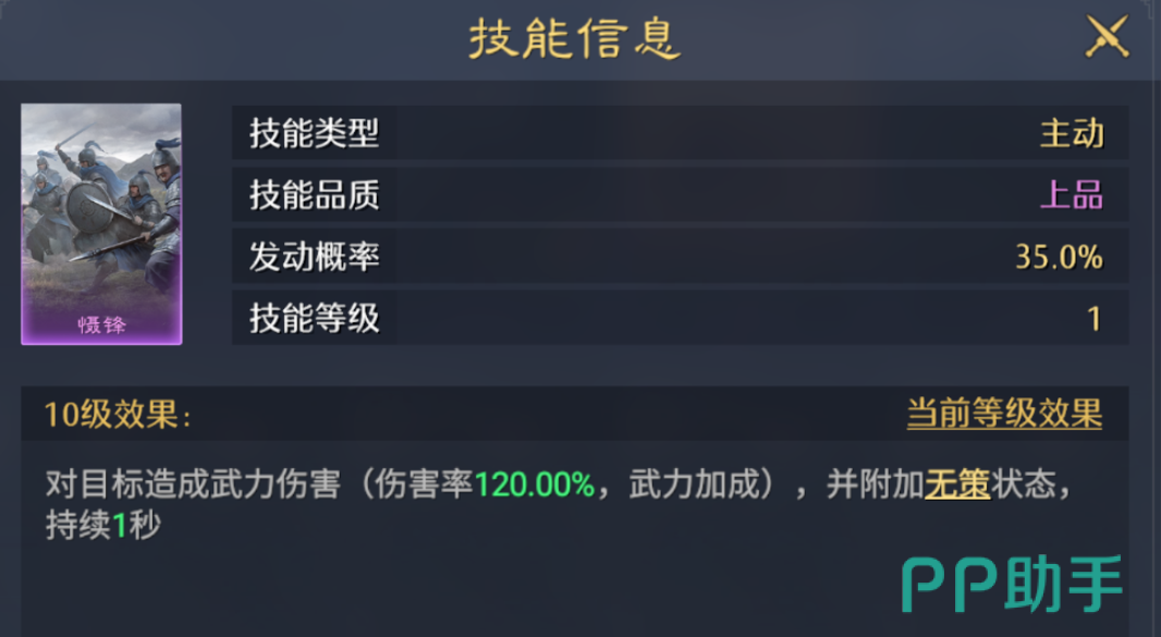 摄锋是一项具备控制能力的物理输出技能,可对目标造成武力伤害并附加持续1秒的无策状态。虽然基础发动概率与伤害倍率并不突出,但其稳定的控场效果使其成为3号位副C武将的理想选择,尤其适配张飞、关羽这类依赖普攻衔接技能的武将。