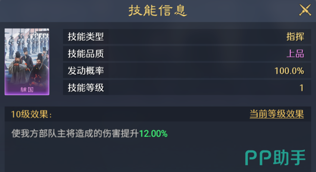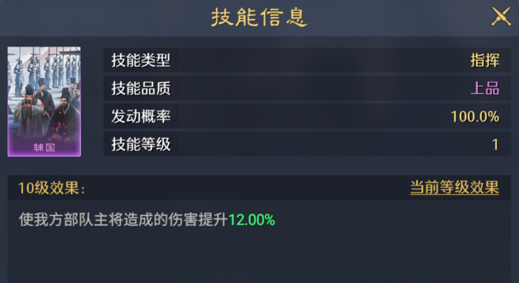 辅国能够提升我方主将造成的伤害达12%,属于稳定增伤类技能。对于以主将为核心输出手段的爆发型阵容而言,该技能可在关键阶段有效放大输出窗口,实现战局逆转。