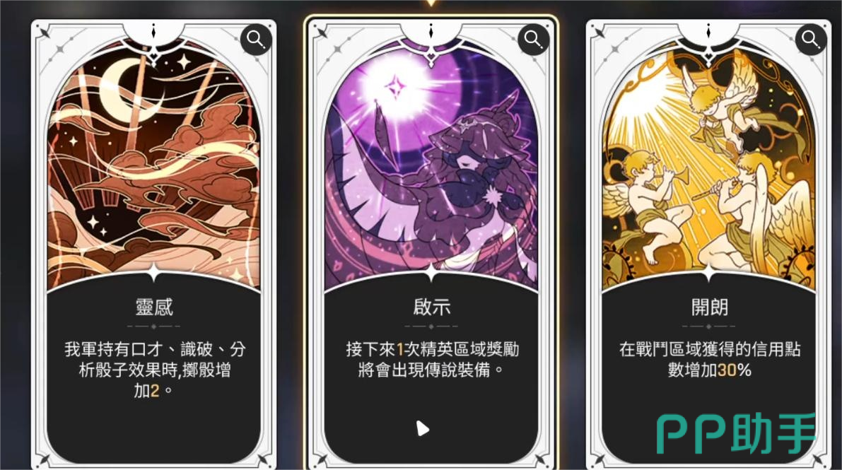 可选的增益效果共有三项:灵感——我方单位的口才、识破与分析类骰子效果提升2点;启示——下一次精英区域结算时必定出现传说级装备奖励;开朗——在战斗区域内获取的信用点数提高30%。这些加成显著优化了资源获取效率和战斗表现,合理选择能有效降低挑战难度。