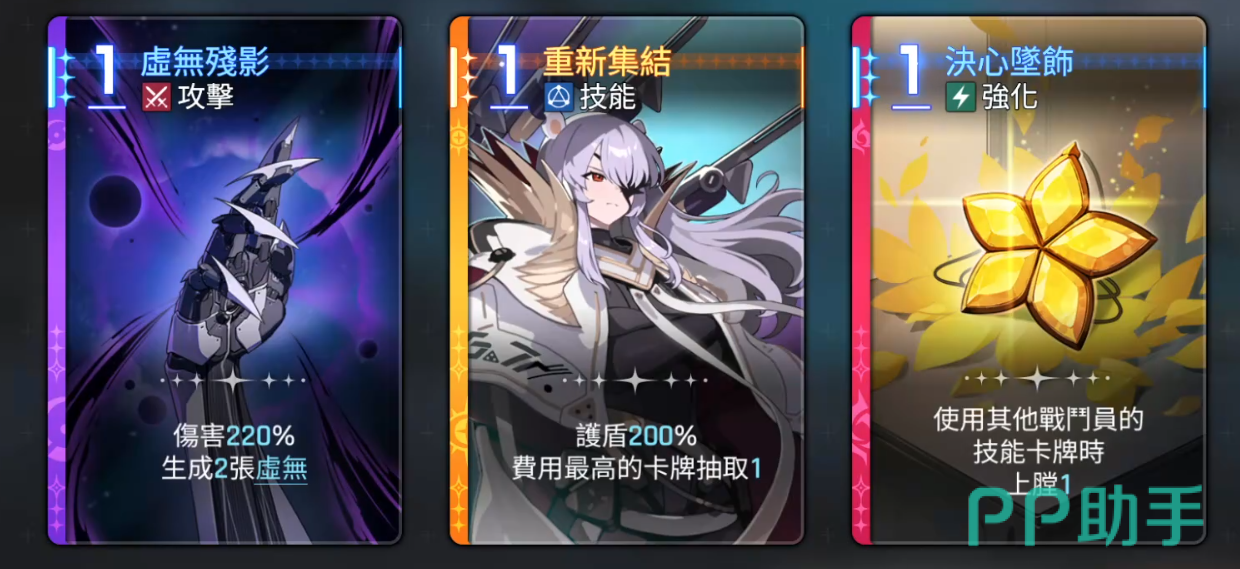 虚无残影为紫色品质配件,提供220%攻击力加成,并生成两张具有虚无特性的卡牌;重新集结技能可在消耗最大费用后抽取一张卡牌,有助于快速获得核心组件,提升连招构建速度;决心坠饰则允许在玩家使用其他战斗员技能卡时完成一次上膛操作,大幅加快输出节奏。