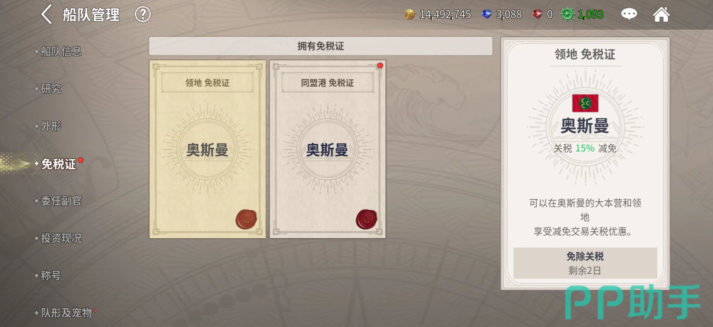 若不确定当前持有的免税证状态,可通过游戏内菜单快速查看。进入团队管理界面,点击“免税证”选项,即可浏览已拥有的证件列表及其剩余有效时间。建议定期检查,避免因过期导致后续贸易过程中多缴税款,影响实际收益。