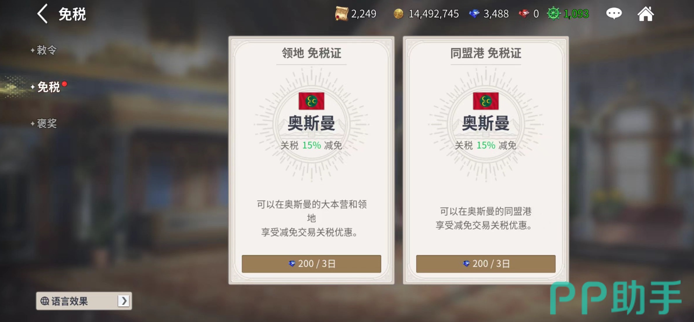 游戏中的免税证分为两种类型:领地免税证和同盟港免税证。前者适用于目标国家的主城及其所属领地范围,后者则可在其盟国港口使用。两类证件均需在对应国家的王宫处以200蓝钻的价格购买,有效期为3天。由于地图上国家众多,并不建议玩家全面覆盖所有地区的免税权限。实际上,只需根据自身贸易路线选择关键国家进行投资即可。通常情况下,本国港口已提供税收优惠,因此重点应放在获取外国市场的免税资格上。结合常用贸易航线与核心商品流向,合理规划证件购买策略,才能最大化节省成本。