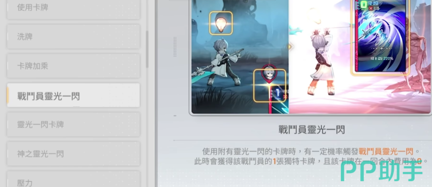 接下来我们就可以看一下灵光一闪的系统效果了,灵光一闪并不是单调的增益效果,他拥有着战斗员灵光一闪、灵光一闪卡牌以及神之灵光一闪,战斗员灵光一闪是在玩家们使用灵光一闪卡牌时,有一定的几率能够触发战斗员灵光一闪,将其触发之后玩家们会获得这个战斗员的增强版独特卡牌,这张卡牌费用完全为零,但是只在一回合之内有效;而灵光一闪卡牌则是在玩家们使用拥有可灵光一闪的卡牌的时候,能够有几率触发卡牌灵光一闪,在触发之后可以在三个选项中选择其中一个强化卡牌,所持有的卡牌会获得强大的效果,两个灵光一闪并不相同。