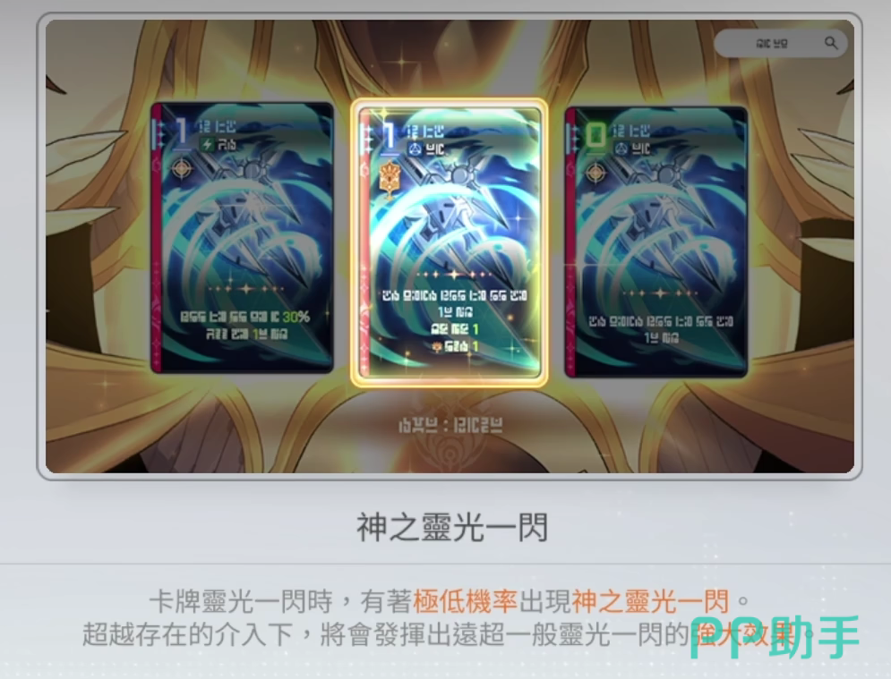 最后就是神之灵光一闪,神之灵光一闪想要触发是比较困难的,因为它需要玩家们在卡牌灵光一闪时才能触发,在触发之后玩家们会获得超越存在的介入,能够获得远超普通灵光一闪的效果技能卡牌,强化效果非常之大,需要注意的是当卡牌已经触发了灵光一闪,那么他就不会再触发神之灵光一闪了,因为他们二者是属于冲突的,并不指同一效果。