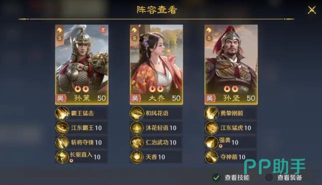 这套阵容是零氪或微氪玩家的理想选择。大乔仅需6元即可获得,孙策通过7日登录任务领取,孙坚则可通过系统邮件免费获取,三人还能激活“江东霸主”羁绊,实现三橙将开局。孙坚作为主将,其怒气技能对带有威压状态的目标可造成1150%的高额伤害,爆发能力极为突出。为了提升整体输出循环,孙策建议携带斩将夺锋与长驱直入两个战法,若暂未获得,可用紫色战法重创和天符猛击作为过渡替代。