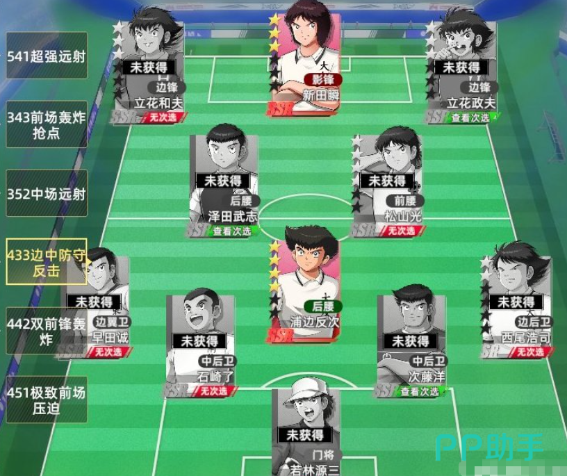 最后介绍的是边中结合的防守反击体系,选用新田瞬、立花和夫与松山光构成战术核心,采用4-3-3阵型布局。这套打法以前场球员的爆发力为基础,边锋与中锋均擅长精射技术,可在反击中快速形成射门。阵中前场人数占优,进攻层次丰富。若近身推进受阻,可立即转为中锋抢点接应,同时前卫适时起脚远射牵制对手防线。多重进攻手段并行,不仅提升了防守稳定性,也大幅增加了反击成功率。