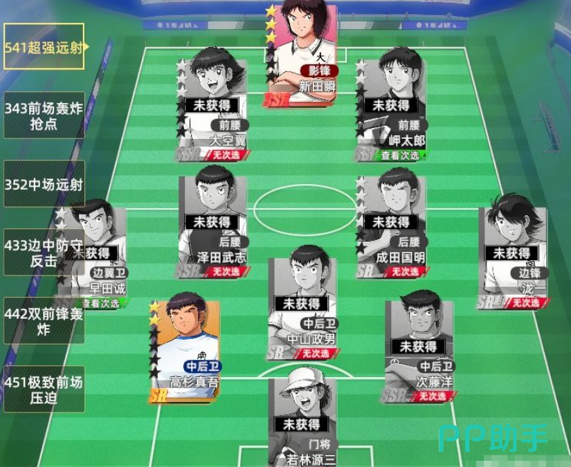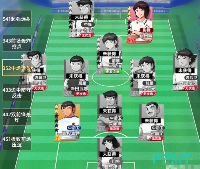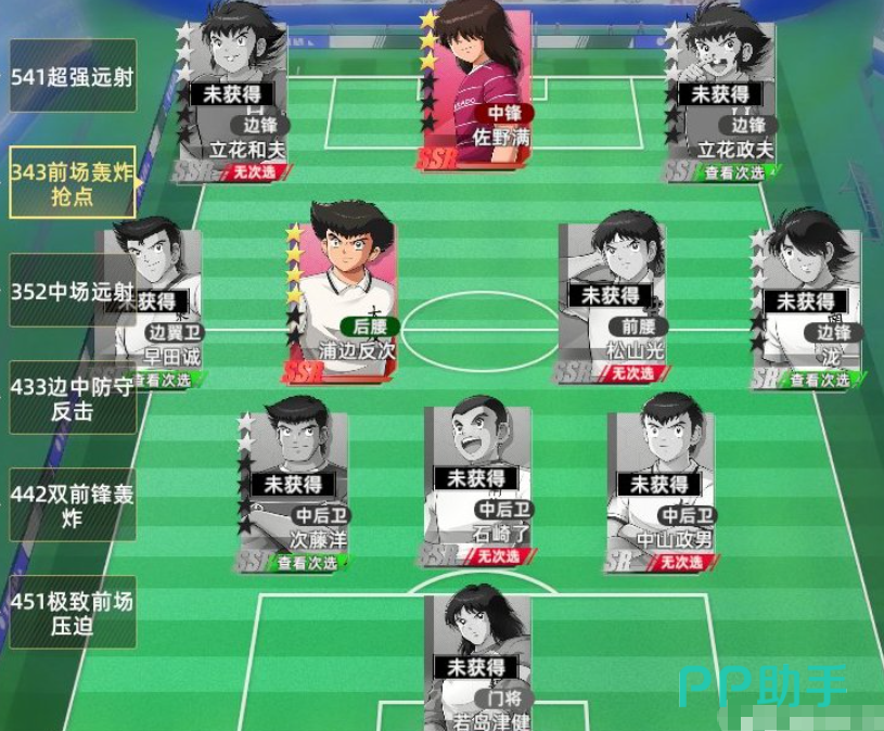 第二套推荐阵容聚焦前场高压打击,核心成员包括立花和夫、立花政夫、佐野满以及早田诚。这套组合主打前锋抢点能力,上述角色在抢点属性上表现突出,能高效把握门前机会。中锋与边锋同样具备抢点特质,使得整个前场形成多点开花的局面。此阵型以前锋为战术支点,整体输出稳定。当对方加强禁区防守时,可切换至边路进攻模式,利用边锋劲射或边翼位远射打破僵局,实现近射与远射交替压制,战术灵活性高。