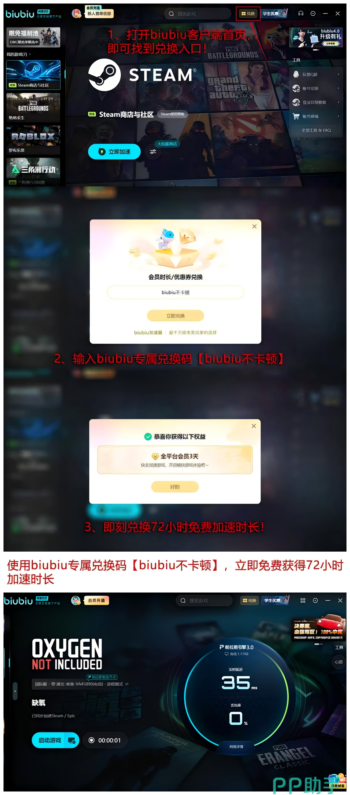 输入【biubiu不卡顿】口令可以领取72小时免费三天时间,新用户直接到手24小时的时间,累计获取96小时的体验时间,对加速不感冒的玩家也可以顺手尝试一下,马上会发现有加速的不同,能体验到超高速的网络以及超级稳定的对战连接,保证各位一切网络动作的安全和稳定。