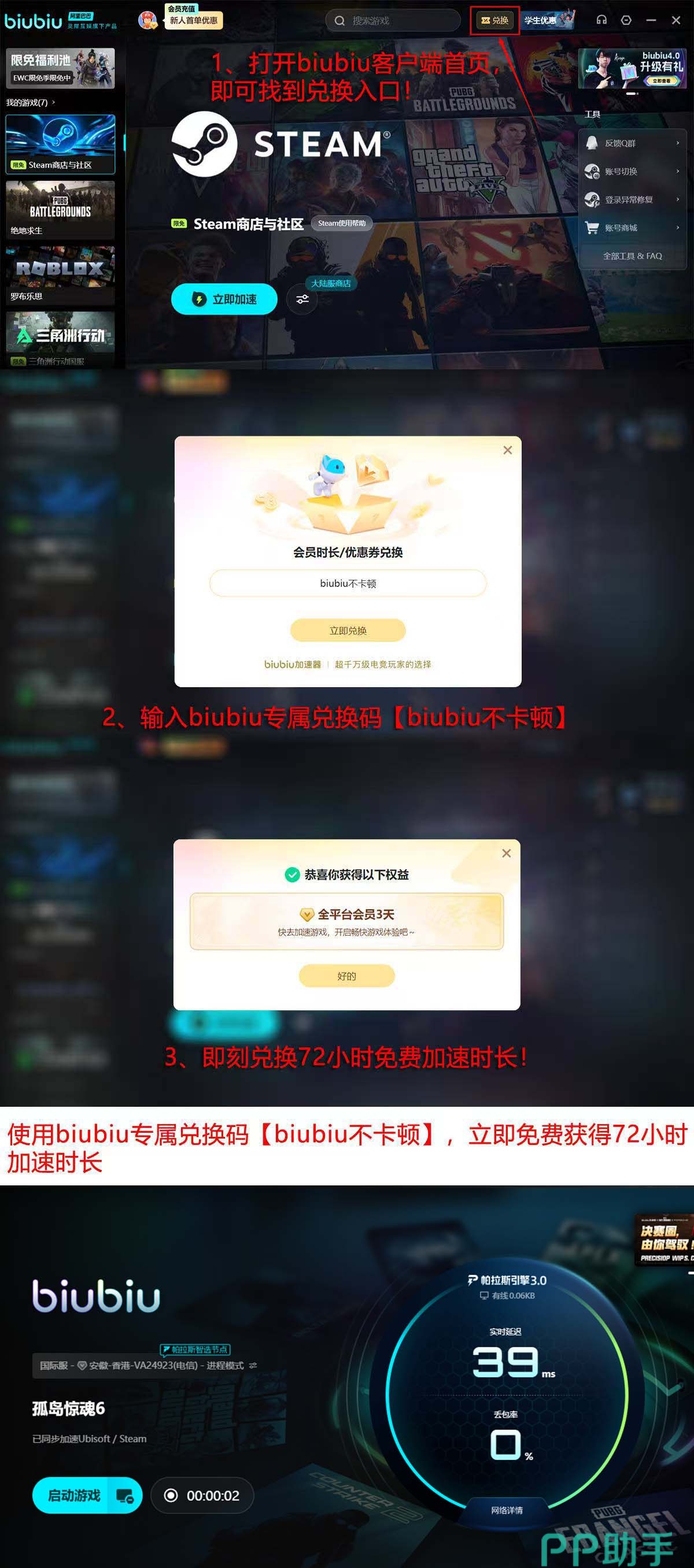 优异的技术能力,在玩这款游戏的时候,就能实现快速触发技能,跑位更准确,当然,说再多大家体验才能在真享受,这里有最多4天的免费体验时间,主要是新人,在成功注册成为了biubiu加速器新会员后,就能立刻得到系统设定的新人24小时福利,然后参与一下,会员才可参与一次的【biubiu不卡顿】口令兑换活动,就能再得到72小时,口令活动老会员也能参加哦!总体上新人能得到96小时免费时长。