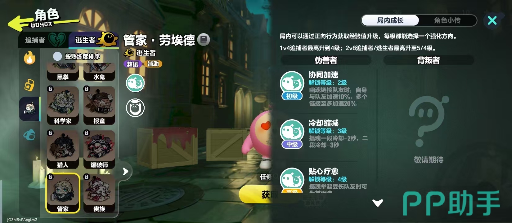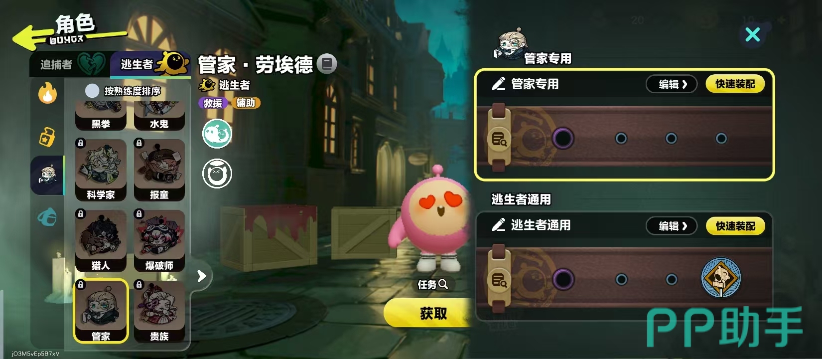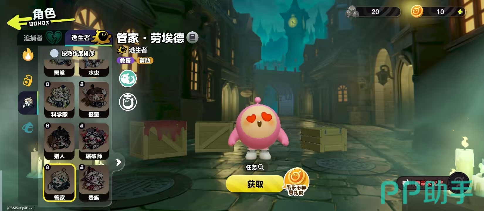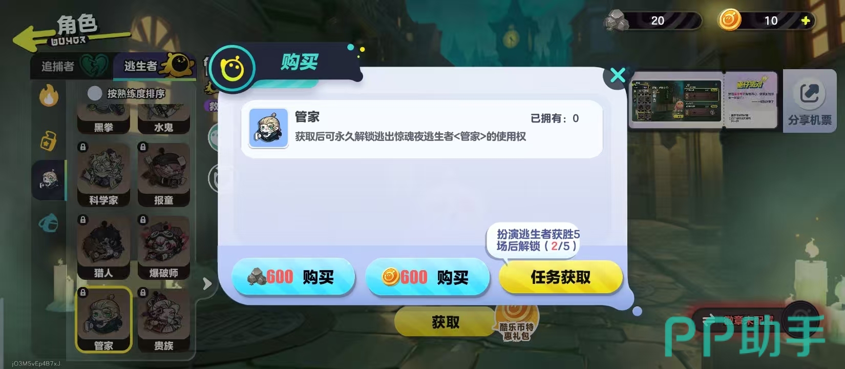 而这一个角色在获取时有三种不同的方法,首先可以通过局内的战斗还有日常任务去获取惊魂矿。这种货币就能够去购买,管家所需要的数量是600个,如果玩家觉得这个方法有一些复杂,也可以选择通过酷乐币购买,同样只需要600个,相对比较简单。通过任务也可以获取,例如扮演逃生者获胜5场之后马上就可以解锁,通过实战积累也可以免费的将它纳入到阵容中,对那些喜欢逃生玩法的玩家而言。这一个解锁方法还是很有趣味性的。