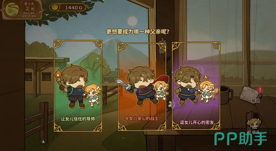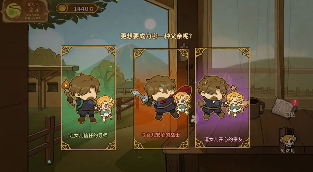 在幼年进入春火年之后,从夏火年到冬火年,每两回合都会出现一次女儿的心事事件,此时玩家必须在三种父亲形象中做出选择,让女儿信任的导师、让女儿安心的战士、逗女儿开心的密友。这三种目标表面上只有风格上的区别,但实际上影响的是评价权重以及某些加成事件的触发方式。导师重在“爸爸很睿智”、战士重在“爸爸很勇敢”、密友重在“爸爸很可爱”,三者都必须同时保持“爸爸很爱我”的累计值。因为最后的评价是由主要评价项加“很可怕、很笨、有点逊”这些隐藏扣分项组成的,所以想解锁全成就的玩家也要提前在这里做好规划。
