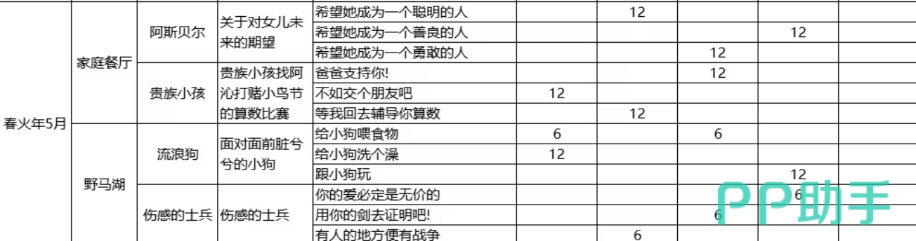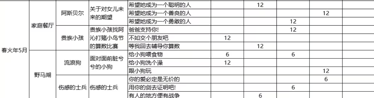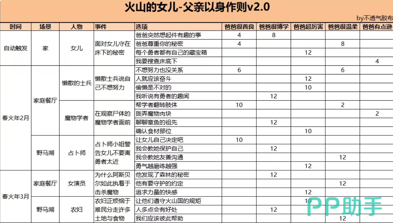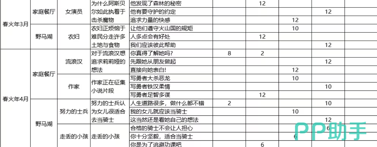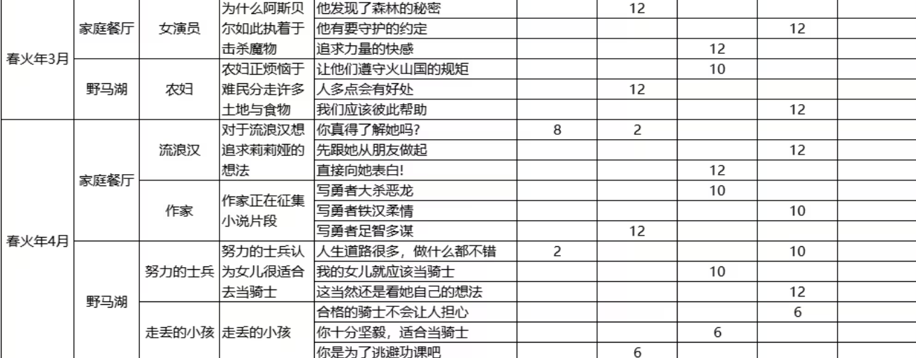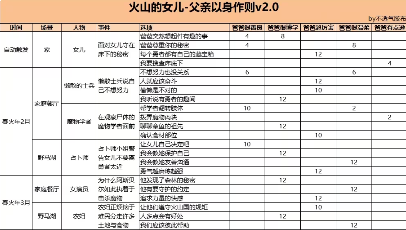 春火年2月至3月,父亲会遇到懒散的士兵、魔物学者、占卜师、女演员、农妇等种种事件,这些事件一般会在家庭餐厅或者野马湖发生。选择“人就应该奋斗”,“聊聊章鱼的祖先”,“勇气越磨练越强”等,就会增加父亲的博学、勇敢、温柔属性,增加女儿的力量、智力、情感、想象力。玩家要按照事件类型以及女儿成长需求做出合理的选择,这样才能获得最大的收益。