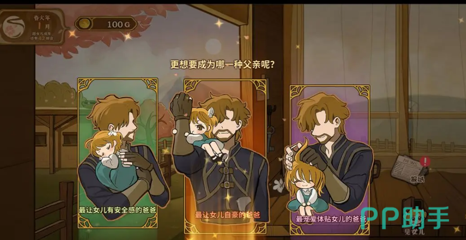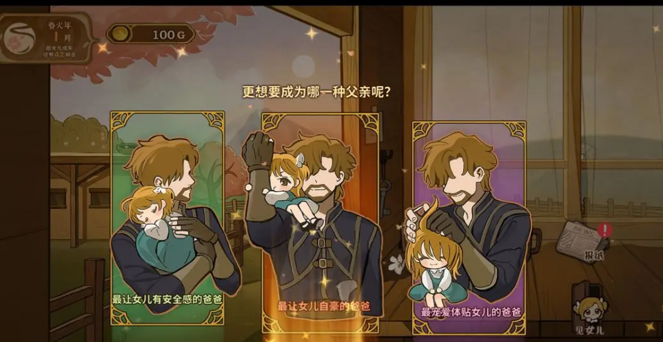 春火年第一阶段父亲会遇到女儿事件,比如1月在家中触发的互动,包括尊重你的秘密、每个勇者都有自己的藏宝箱等选择,每个选项都会带来不同的加分,选择爸爸尊重你的秘密可以增加爸爸的温柔和善良属性,而选择每个勇者都有自己的藏宝箱则会大幅提高超厉害评分。正确选择可以给父亲在女儿心中留下良好的印象。