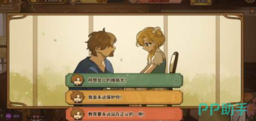 夏火年期间,玩家会遇到女儿在2月、4月、6月、8月、10月的心事。夏火年二月的“三位领主关系”事件中,选择“我会永远保护你!”可以提升女儿的情感和魅力值,也可以提升爸爸的可爱、爱我评分;选择“讲述三位领主之间的制衡之道”可以提升女儿的智力、头脑值,也可以提升爸爸的睿智评分。每个选项的加成不一样,玩家要按照女儿成长的需求来合理分配行动点。