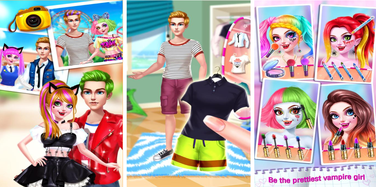 在本作中玩家有机会给吸血鬼女孩设计一个生动性感的妆容,也可以搭配形形色色的服装让女主角光彩夺目,游戏采用恋爱主题的剧情设定再结合装扮玩法,双主角的设定也可让玩家为情侣两人设定时装,画面风格很明亮且带来的装饰道具光怪陆离,各种妆容随意切换足以强化女生的打扮技术,恋爱约会的场景更多足以提供更新鲜的代入感。