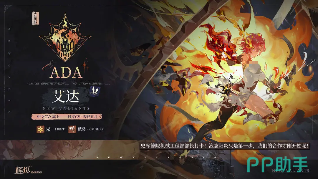 辉烬艾达是一位全新的光属性破势角色,凭借其极具辨识度的外形设计迅速吸引了大量玩家关注。她拥有精致的五官与标志性的红发造型,整体形象既干练又充满力量感,战斗风格同样以高爆发和强压制著称。作为当前版本中输出能力极为突出的角色之一,她的技能机制围绕“共鸣值”与“威势”两大核心资源展开,操作空间大且连招灵活。下文将详细介绍她的技能设定,帮助大家全面了解这位强势新角。