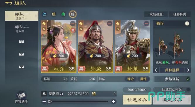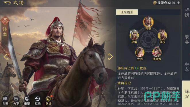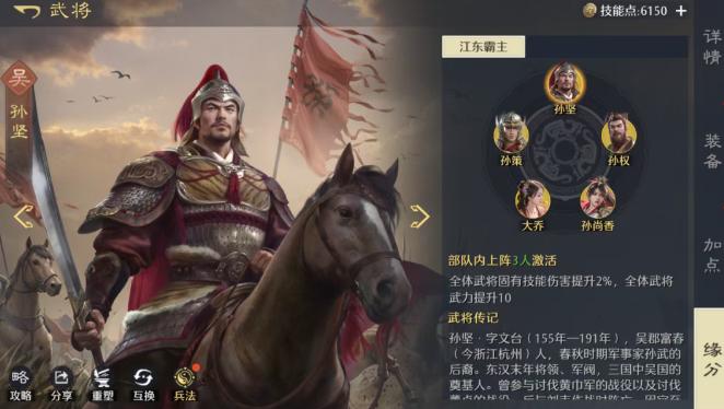 从战法搭配来看,大乔推荐装配【仁治武功】与【天香】,以强化治疗与减伤能力;若暂缺也可选用其他恢复类或防御型战法替代。兵法建议选择励军系,如以逸待劳、奋鼓、乐善、固军等,进一步增强团队持久作战能力。孙坚定位为功能性副将,主要作用是施加“威压”状态进行控场,生存优先,战法可选伺机而动+天符猛击,兵法走刚毅系路线。