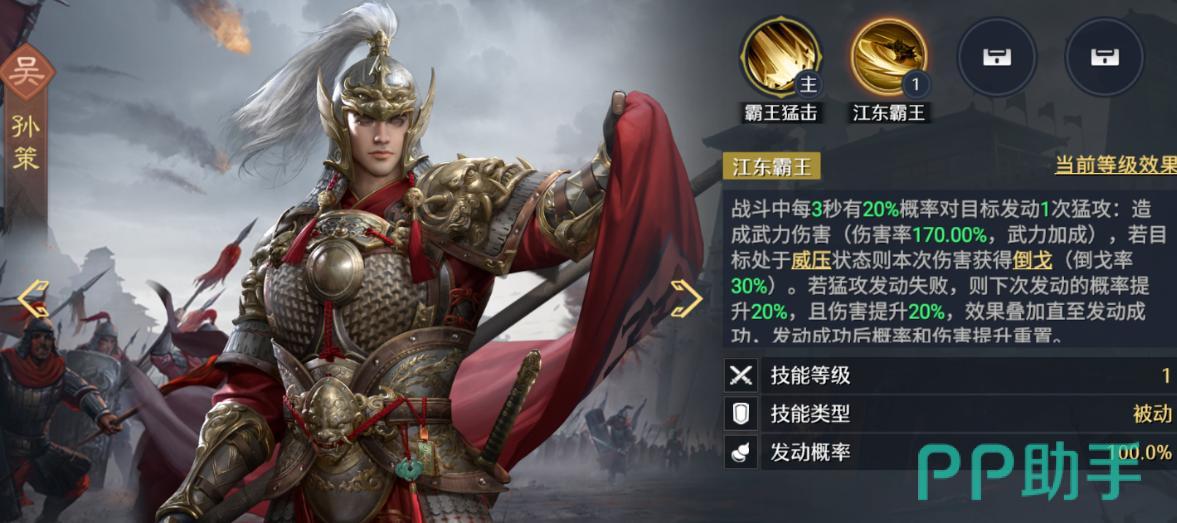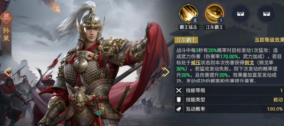 副将方面,孙坚承担前排承伤职责,提供控制效果并维持战场稳定性;孙策则作为核心输出点(主C),依靠自身优秀的技能机制打出高额物理直伤与后续持续伤害。该角色对装备依赖度较低,输出连贯性强,在开荒期表现出色。
