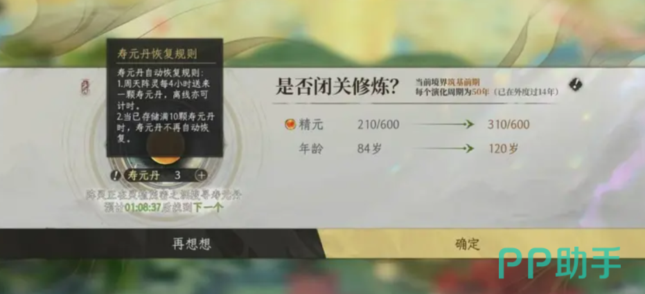 需要注意的是,每次闭关不仅会恢复精元和刷新地图资源,还会使角色年龄增长。一旦年龄超过当前寿元上限,将无法继续闭关。因此建议提前准备并使用寿元丹,以延长寿命上限,确保修行进程不受阻碍。