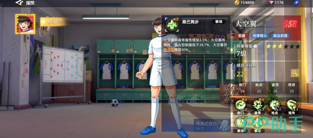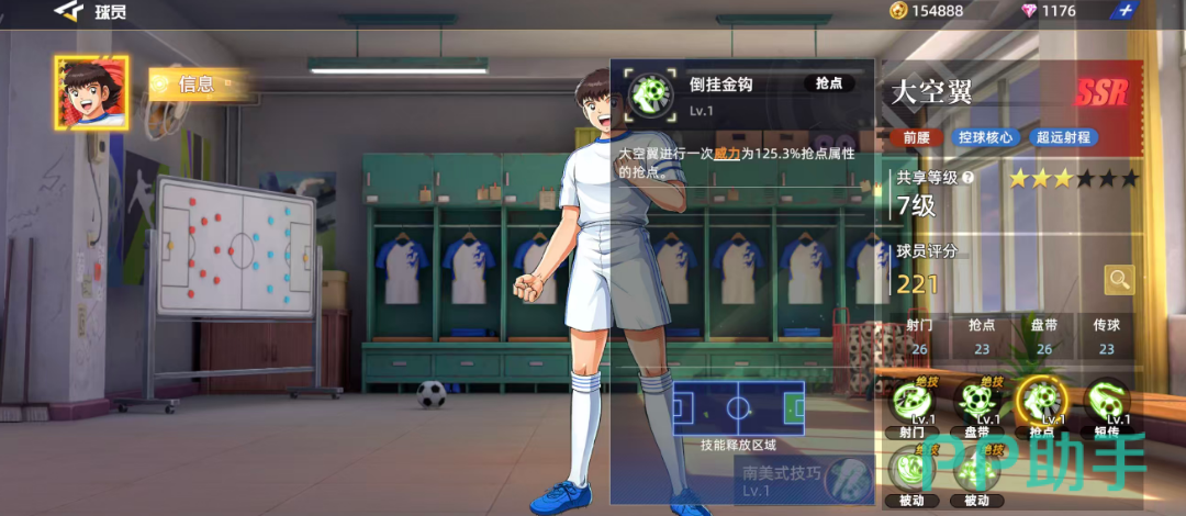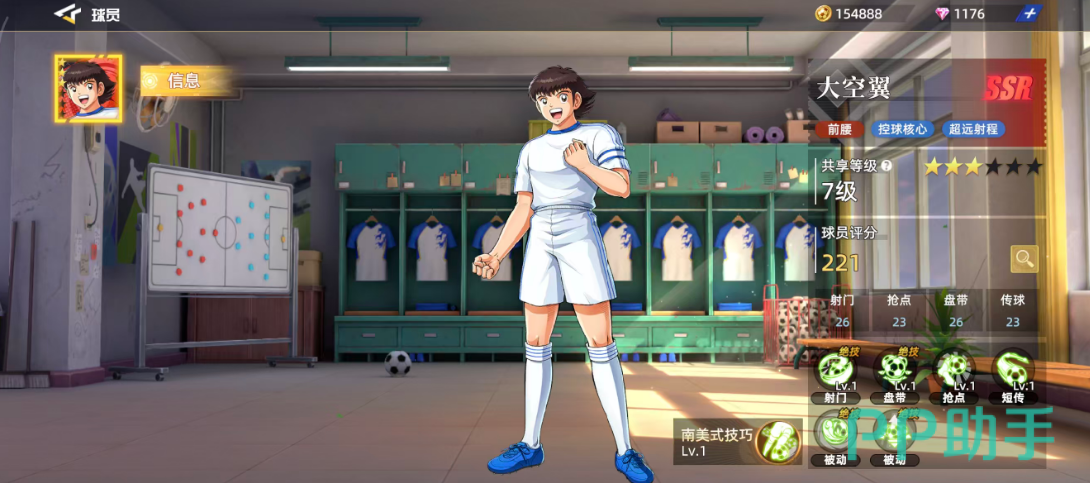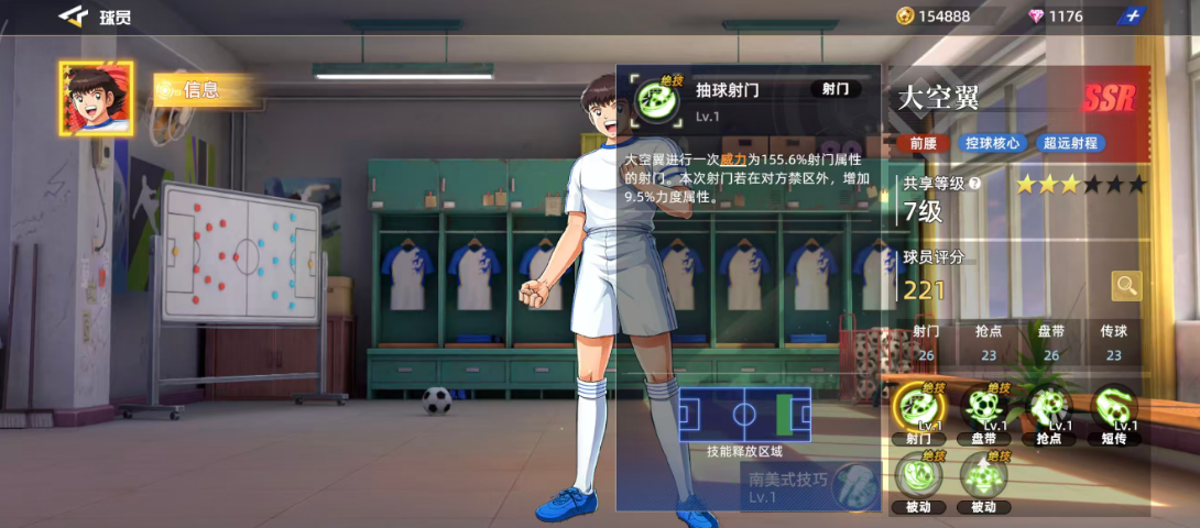作为SSR品质的核心角色,大空翼在游戏内的单卡评分达到了惊人的221分,这一数值远超大多数球员,甚至在整个阵容体系中都极为罕见——目前极少有角色总评能突破200分大关。他主要担任前腰位置,不仅具备出色的球场掌控力,还能有效带动全队节奏,是典型的战术核心型选手。同时,其覆盖范围广泛的射门能力使得他在中场任何区域都有可能发动致命一击。