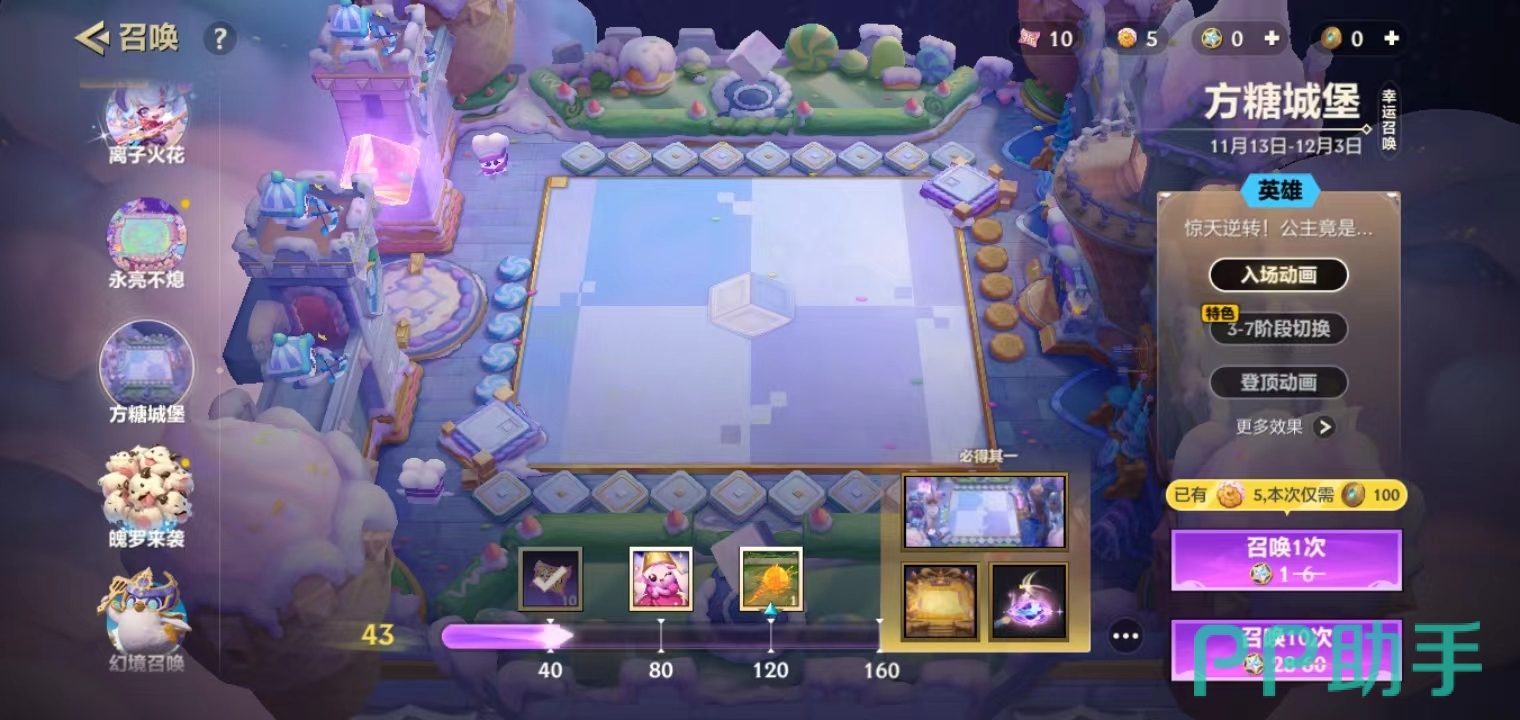 作为英雄级棋盘,方糖城堡需通过幸运召唤获取,初始掉落概率为1%。根据实际测试数据,大多数玩家在累计抽取300次左右即可保底获得,整体获取难度处于合理范围,并未设置过分苛刻的门槛。本次召唤池中同步上线了焦糖厨房主题,适合偏好温馨风格的用户选择。但综合来看,仍推荐优先抽取方糖城堡,因其阶段切换机制具有唯一性,未来复刻可能性较低。这里提供一个小技巧:建议提前积攒足够数量的召唤券,再进行10连抽操作,有助于提升获取效率,增加获取目标道具的概率。