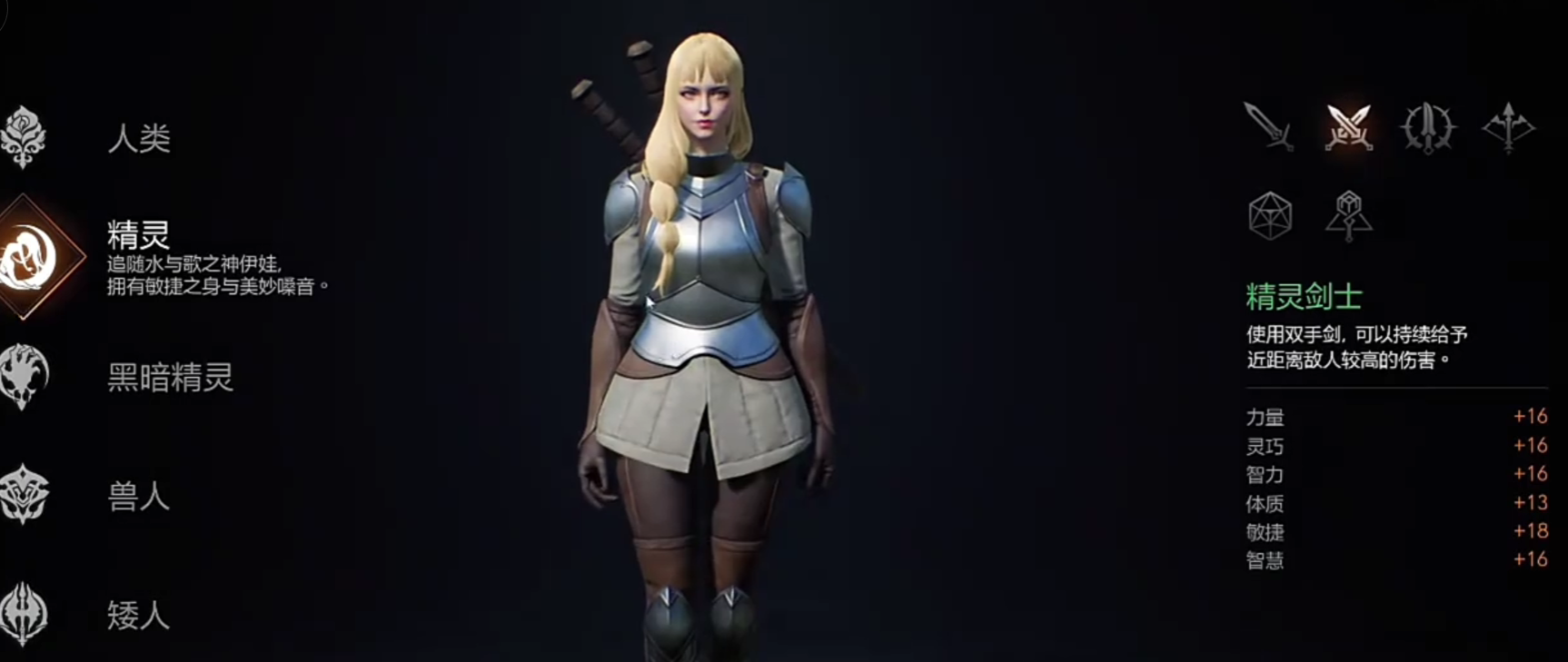游戏在角色创建阶段即引入了多元化的种族与职业搭配机制。目前已知共有五大可选种族:人类、精灵、黑暗精灵、兽人与矮人。每个种族不仅拥有独立的文化背景,在基础属性分配上也存在差异。例如,人类各项能力较为均衡,适合多种发展方向;精灵则偏向敏捷型定位,具备出色的移动与闪避优势;黑暗精灵擅长黑魔法运用,同时具备较强的生存韧性;兽人以高体质著称,初始体质值可达22,是近战职业的理想选择;而矮人除了身体素质突出外,还拥有精湛的工艺技能,适合从事制造类副职。