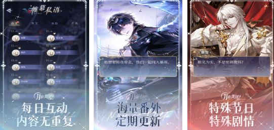作为核心的女性向游戏,玩家进入游戏之后将成为女配角,作为见习吸血鬼猎人,就需要和半人半血族的仇人同居。剧情甜虐交织,每一周都会更新最新的章节,带来持续的新鲜感。这一种不氪金的设定,让所有的玩家都可以沉浸于剧情中,吸血鬼的世界观还会充满神秘的感受。每一个角色的人设都是立体鲜活的,甚至连对话的细节都会包含情感的温度,比较适合于那些喜欢沉浸式恋爱的故事玩家。