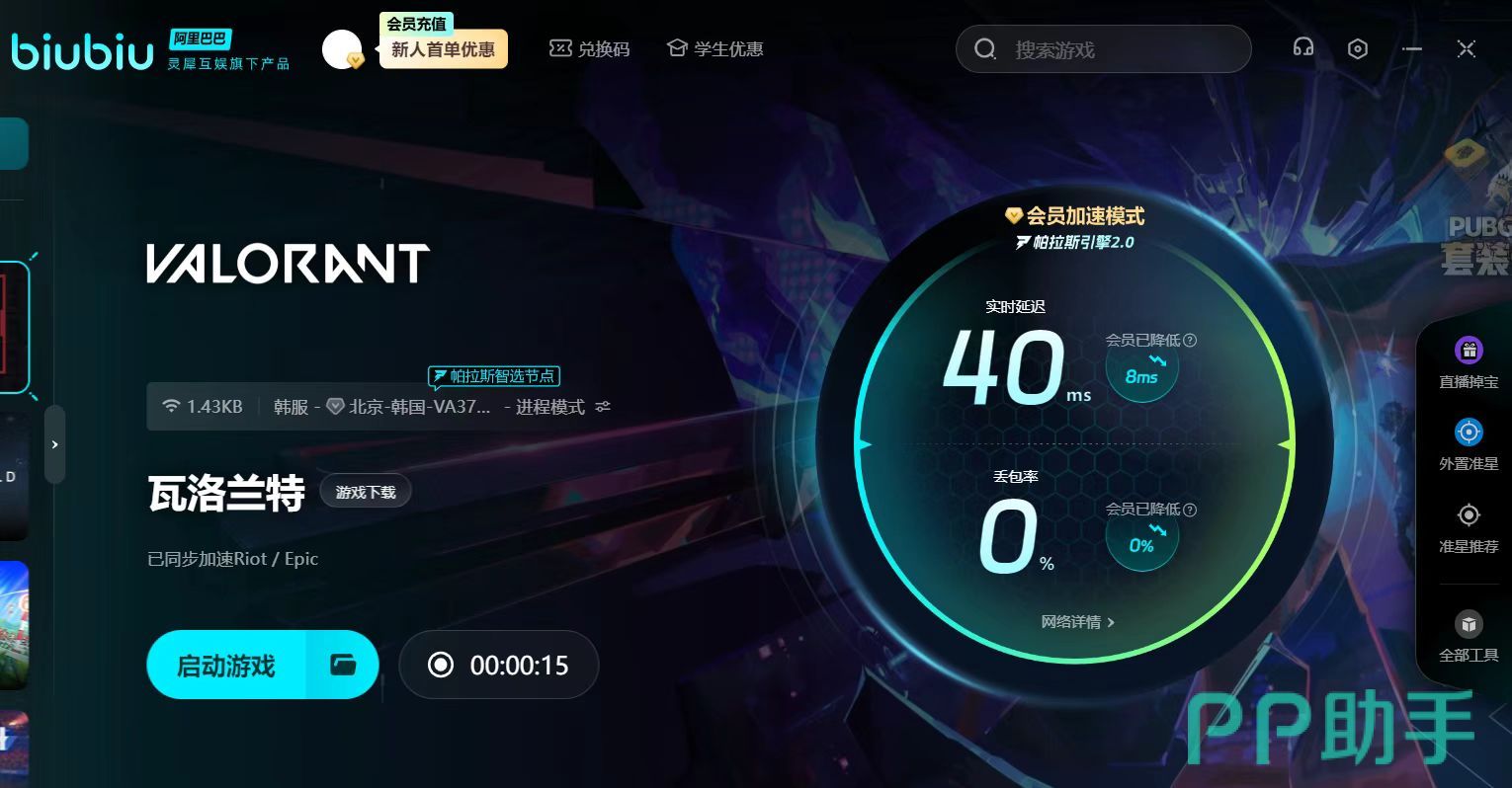 针对瓦洛兰特的网络优化需求,biubiu加速器采用先进的AI智能选路技术,能够自动识别并连接最优数据传输路径,显著降低游戏延迟和丢包情况。通过多倍发包技术和流量保护策略,确保游戏过程中数据传输更加平稳,有效减少卡顿与断连现象。无论是在快速突进还是精准瞄准的瞬间,玩家都能感受到更顺滑的操作响应。