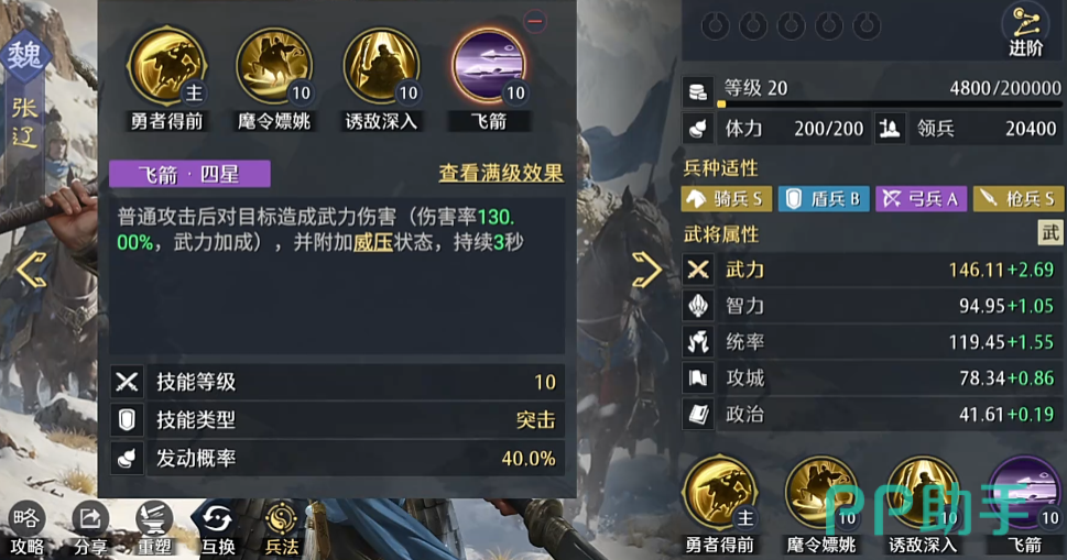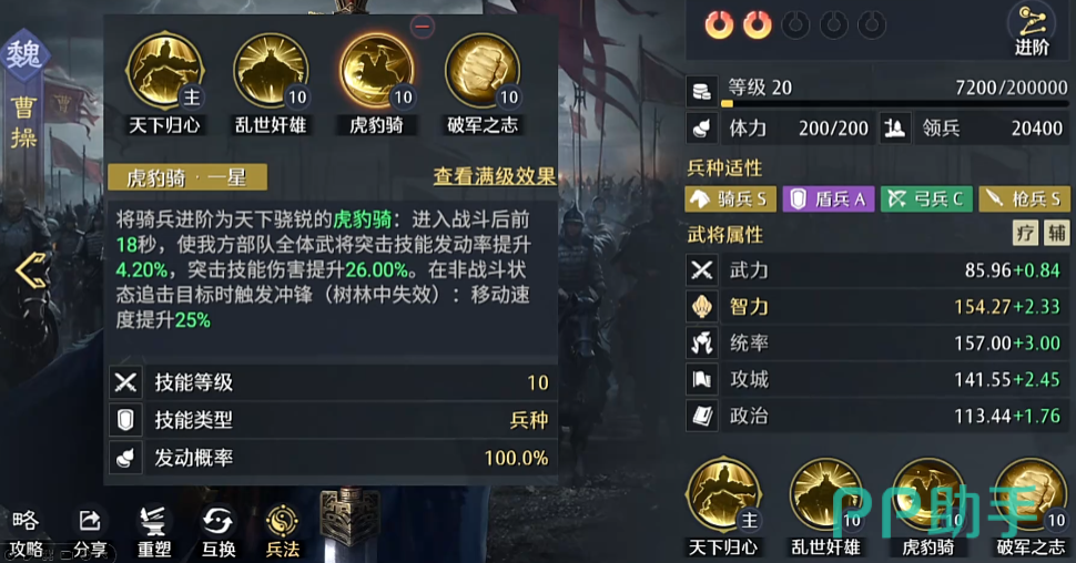 本篇介绍的这套阵容,核心目标在于追求极致的物理输出表现。不过需要注意的是,队伍整体生存能力较弱,缺乏足够的坦度支撑,这一点从武将所携带的技能类型即可看出。以夏侯渊为例,他拥有两个S级适配兵种:骑兵与弓兵。在当前阵容构建中,普遍采用骑兵进行搭配,主要原因在于虎豹骑带来的机动性加成与团队协同效果更优。相较之下,若改用诸葛连弩弓兵,则整体作战效能明显下降。