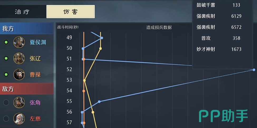 张辽在此阵容中的技能配置,主要作用是为夏侯渊创造更高的输出环境和衔接机制,形成高效的伤害循环。而曹操则作为纯辅助角色登场,专注于提供增益状态与属性加成,进一步放大夏侯渊的打击能力。整支队伍的伤害几乎全部依赖于夏侯渊的技能连发与普攻联动,单次爆发可稳定达到一万二至一万三左右的数值,且攻击频率极高,能够在多个回合内持续打出可观的阶段性输出。