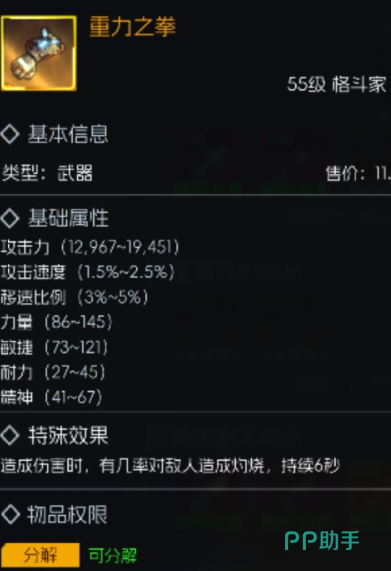 同属深渊副本产出的还有格斗家专用武器“重力之拳”。其基础属性与“离子之火”相近,但特殊效果表现为更高频率的灼伤触发,且持续时间延长至6秒。相比其他同类装备,它在持续压制方面表现更优,适合长时间战斗场景。由于这两件装备均需通过深渊副本获取,整体强度高于常规打造装备,是进阶玩家的理想选择。