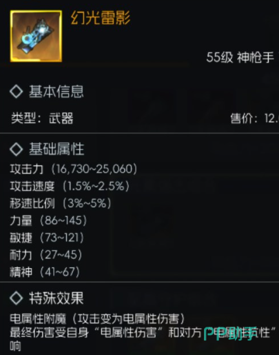对于追求极限强度的玩家,还可尝试获取远古打造系列武器,如“幻光雷影”与“熔岩铸拳”。前者适用于神枪手,激活后将所有攻击转化为电属性伤害,并附加额外电系增益。命中敌人后可使其移动速度降低50%,持续8秒,兼具控制与增伤双重优势,战术价值极高。