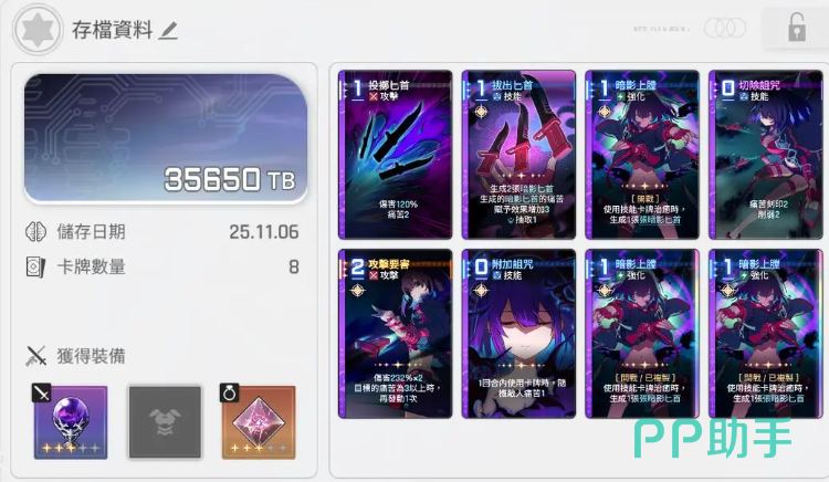关于卡组管理,德蕾莎需要定期清理无用卡片以维持运转效率,而其他成员则无需过多干预。【暗影上膛】作为核心赋能卡,建议复制数量控制在三张以内,避免资源浪费。毕竟开局仅有3点能量,过多高费卡反而会影响出牌节奏。后期主要依靠复制出的飞刀卡持续输出,形成稳定的伤害链条。