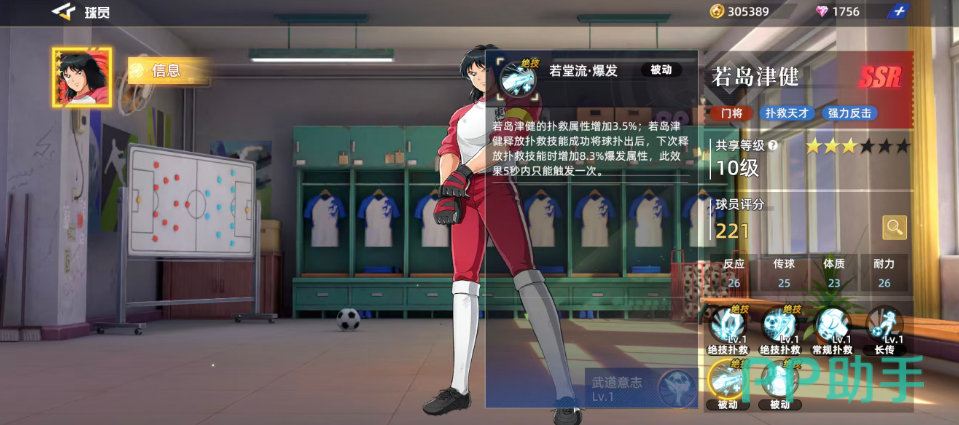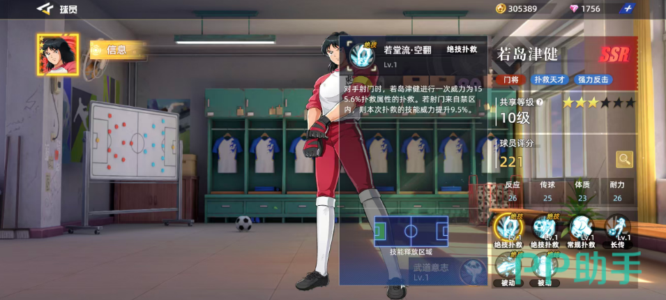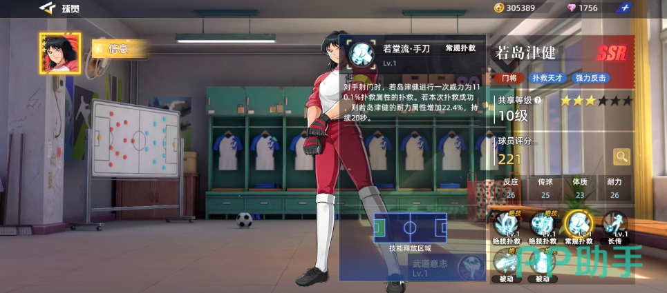 在技能配置上,若岛津健拥有多个高效扑救机制。其主动技“若堂流·空翻”可在对手射门时发动一次相当于155.6%扑救属性威力的拦截动作;若射门源自禁区内,则该技能威力额外提升9.5%。另一技能“若堂流·蹬跳”专用于应对高空争顶情况,触发时基于115.6%反应属性进行扑救,且当自身体力低于50%时,反应属性增益提升25.3%,显著增强残局防守能力。