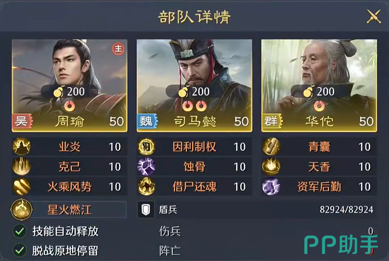 第三位成员华佗主要负责团队续航和辅助控制。建议给它配“天香”和“陷阵营”,“陷阵营”可以提升全队生存,如果没有“陷阵营”可以使用“仁治武功”、“刮骨”或者“后勤”等治疗战法代替,保证队伍连续作战有血。华佗的存在可以提高队伍的持久战能力,也可以给火毒盾阵容提供稳定的支援,保证在面对强敌的时候依然能保持战斗力。