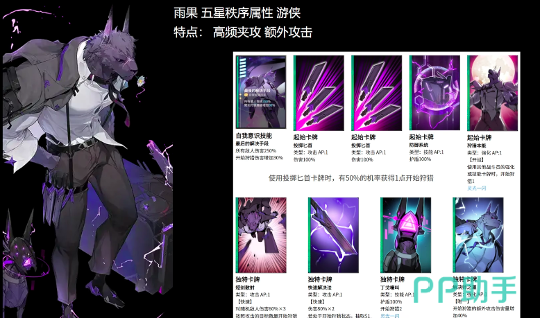 再来看狼哥——雨果,隶属于五星秩序属性的游侠,它的总特点是高频攻击,并且可造成额外攻击,小编接下来来详细说一说,核心被动效果——“狩猎启动”,进入到“狩猎”状态后,如果其他战斗员使用的是单体攻击卡,额外进行70%的伤害,追加攻击减少一层;如果其他战斗员使用的是非攻击卡牌,则增加一层,每层增加30%的伤害,且最多可增加5层,而这一技能无论从伤害,还是额外伤害的数值来看都是相当惊人的。