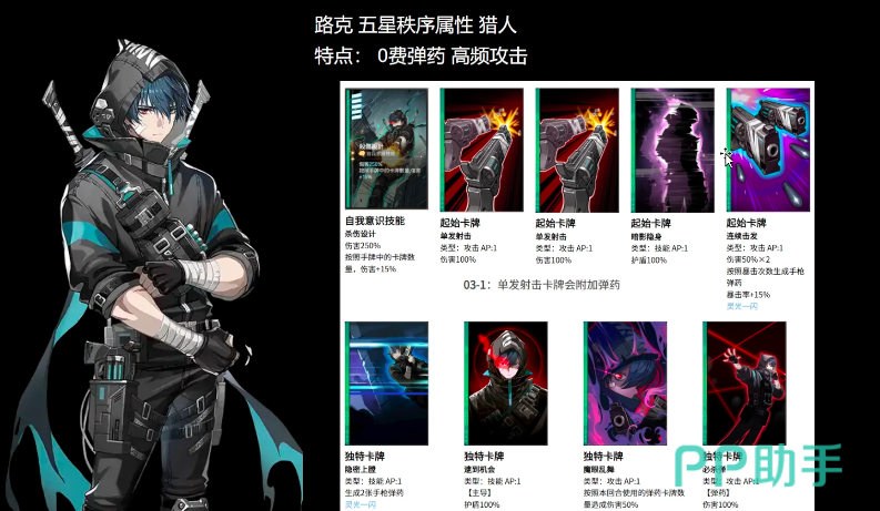 虽然在内测时期对洛克这个角色评价都较为一般,但就其卡组来看,不难推测他的后期潜力还是非常巨大的,尤其是角色的命中2命提升也是比较大的,角色的核心玩法主要是弹药,弹药目前是一个0费的模式,并且可造成高频率的攻击,从卡组阵容来看他使用攻击牌的频率会非常高,并且在费用要求上也比较低,新手玩家可尝试。