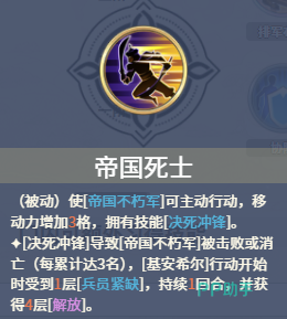 在三阶的时候,他可以选择的是帝国死士以及排军布旗这两个技能,首先左边选择的是帝国死士这个被动,利用这个被动,可以根据他周围的帝国不朽群带来主动的行动能力,此时他在移动效果上面会增加3格的范围,而且利用技能来进行输出的话,可以用到的就是角色冲锋的这个能力,冲锋在这里可以让帝国不救军被击败或者是消亡的时候,让基安希尔的行动得到一个兵员紧缺的效果,后期他自身还可以得到四层解放的积累,所以他目前的这个效果相对来说会比右边的排军布旗更好用一些。
