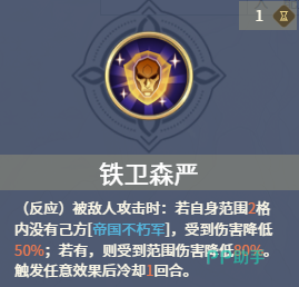 而铁卫森严这个技能的话,作为他的反应技能在其中是同样被敌人攻击的时候可以用到的,此时的话会根据基安希尔他周围范围两个格子之内的帝国不朽军数量来进行判定,如果此时基安希尔周围两个格子之内都没有帝国不朽军的话,根据这个技能效果,他受到的伤害数值也会降低50%,如果此时周围有帝国不朽军的话,那么大家受到的范围伤害降低80%,所以在目前技能选择当中,建议大家还是用右边的铁卫森严带来的整体防护效果会比左边的忍耐更好用一些。