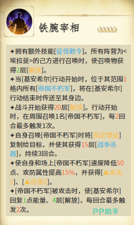 根据基安希尔阵营达到的埃拉曼己方成员带来召唤的时候,就可以让召唤物身上的效果得到足够的解放能力,通过他这样的技能来看的话,只要行动一开始,在他范围之内,一格当中所有的帝国不朽军都会根据他的能力来传送到身边,所以这个角色目前使用的话,其实带来的群体效果是比较好的,基安希尔处于1阶的情况下,可以选择技能有沙海战士以及协防的能力,如果是选择沙海战士技能的话,带来的是被动免疫的效果,在其中可以免疫的能力是对于致盲这类效果的一个免疫,而且在他主动攻击之后,如果敌方正好处于一些土地格子的话,那么此时还会附加10%的攻击效果,在攻击能力上面带来的是穿透类型的伤害,以及根据目前土地属性增加的属性元素伤害,比如说放在沙地格子上的话,那么此时带来的就是沙地属性的攻击能力。
