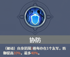 另外在协防这个技能上面,他被动触发的则是根据其中的友军来带来防御提升的能力,最多的情况下,基安希尔可以根据自身范围,只要两个格子里面存在一个敌军的话,就可以带来10%的提升,最多的情况下,他周围可以存在4个这样的敌军,所以他如果达到被我方队友包围的一个效果,能够达到的最高被动提升数值也达到了40%,所以相比较来说的话,右边这个能力为他带来的防护效果会更好。
